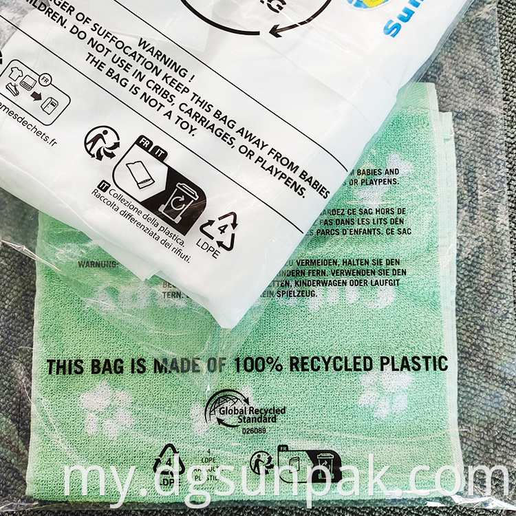 Polybag သည် 30% သို့မဟုတ် 50% သို့မဟုတ် 70% သို့မဟုတ် 70% ပြန်လည်အသုံးပြုနိုင်သောပစ္စည်းများဖြစ်သည်။ ကျန်တဲ့ပစ္စည်းအသစ်မှာ 100% ပြန်လည်အသုံးပြုခြင်းဆိုသည်မှာပြန်လည်အသုံးပြုခြင်း,